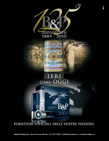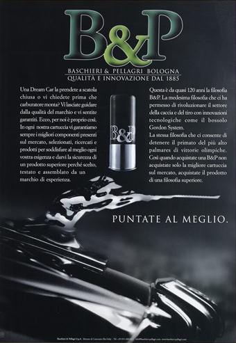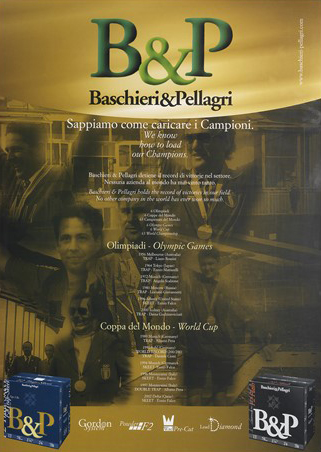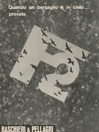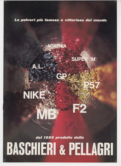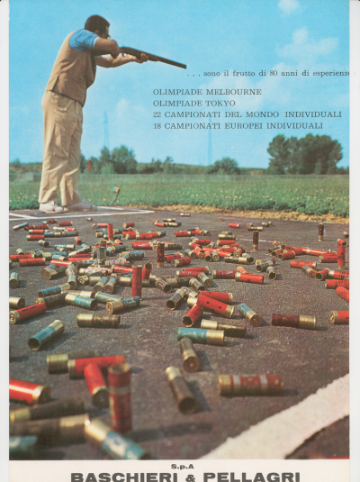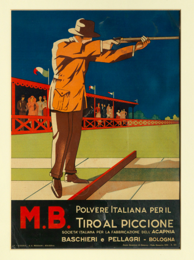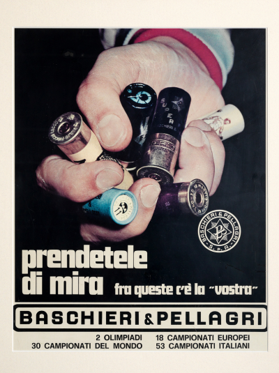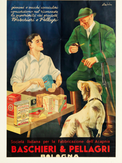 Del primo fanno parte i manifesti storici di Baschieri & Pellagri. Il più noto e spesso pubblicato è realizzato dalla Litografia Ausonia di A. Reggiani di Bologna, nella seconda metà degli anni ’30. Il giovane cacciatore seduto presenta al più anziano, i nuovissimi prodotti B&P con riferimento alle polveri Anigrina Lamellare e MB, che si contrappongono alle più storiche.